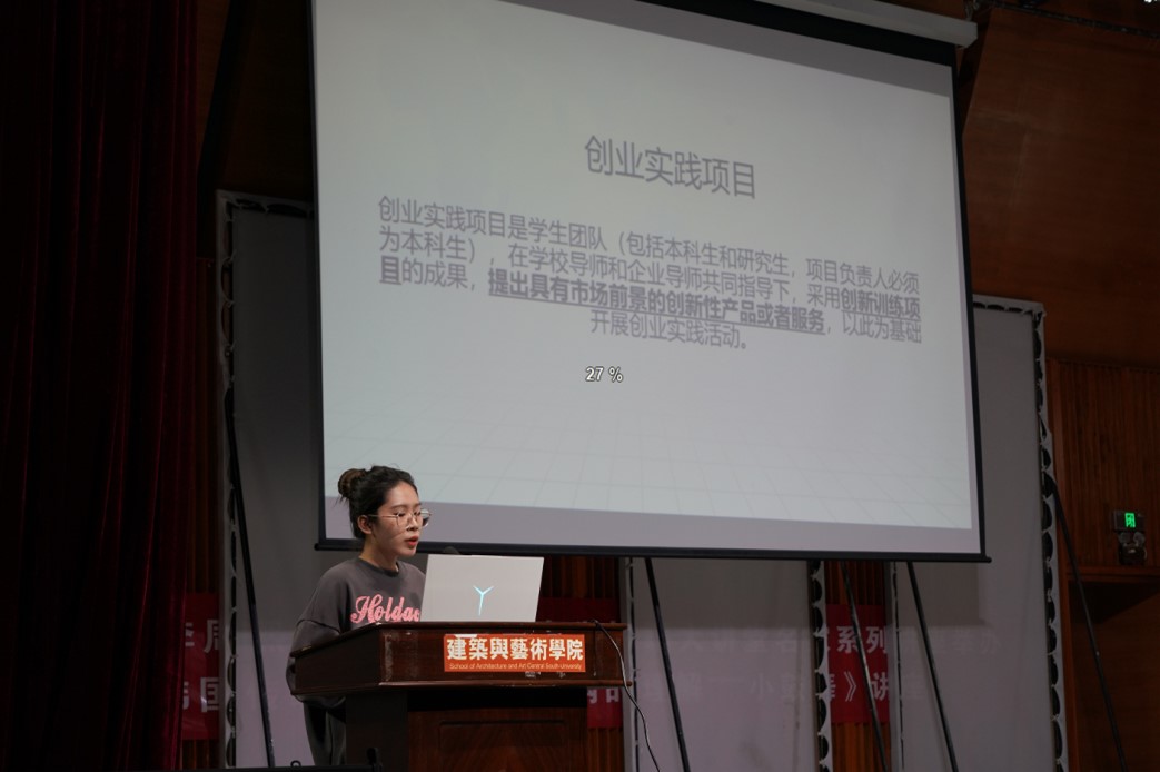 首先,院团委学术创新部陈子萱同学详细介绍了老员工创新创业的重要性,着重对创新创业项目类型、赛道以及流程进行了解释说明,具体讲解了项目申报要求与注意事项等。