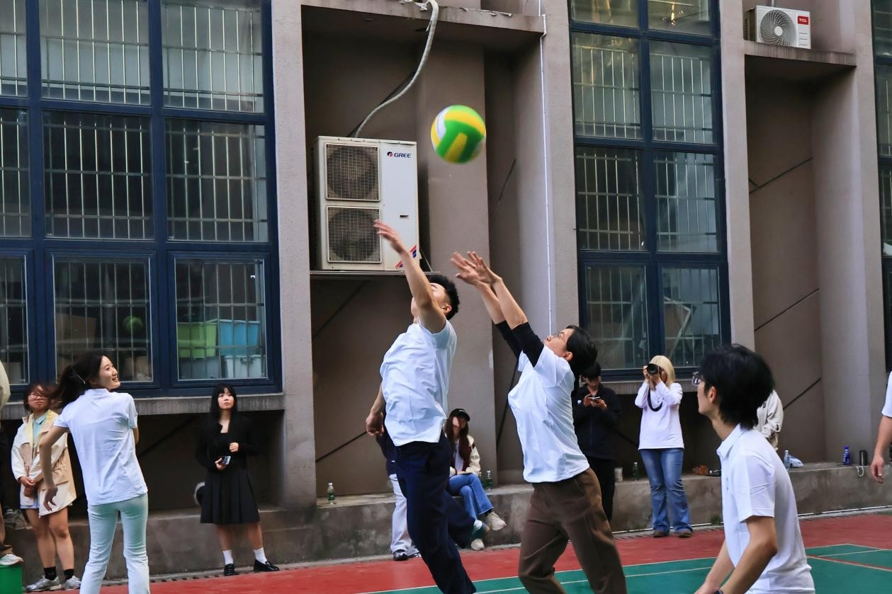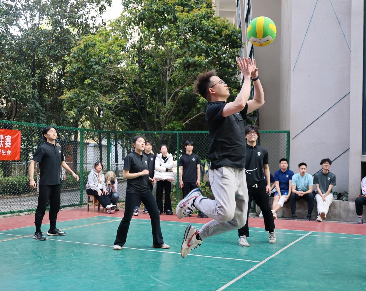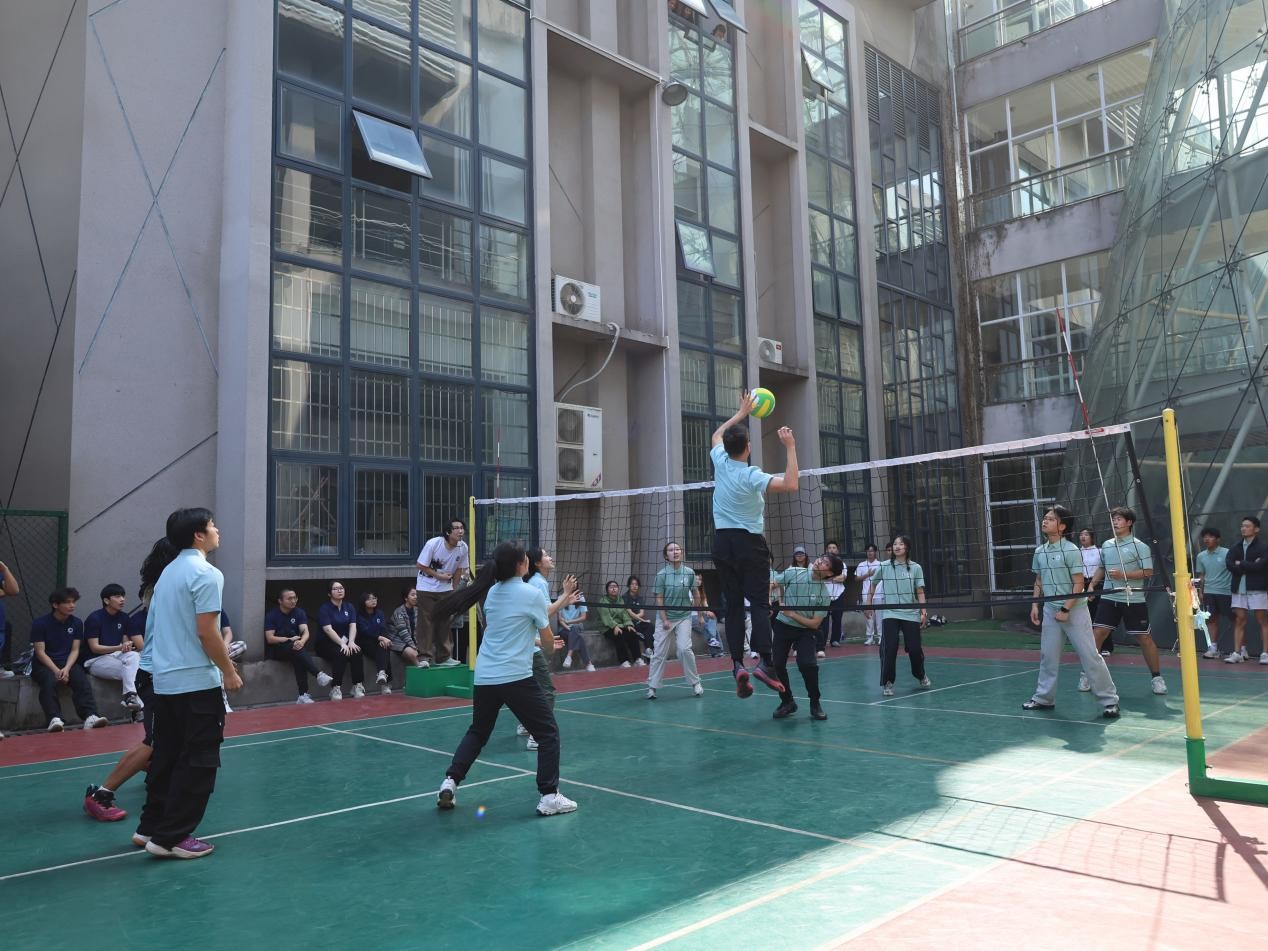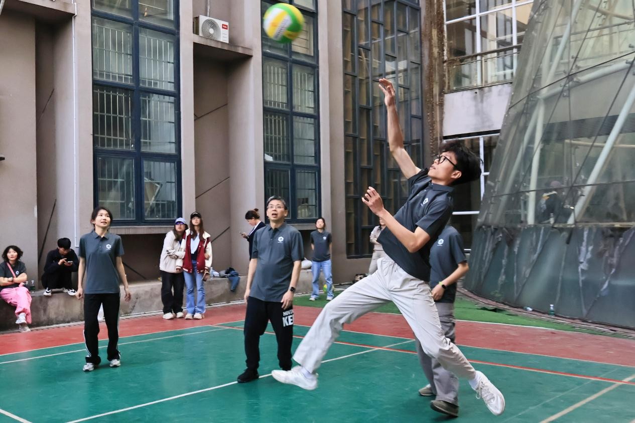 赛场上,师生们默契配合、攻防有度,将日常训练的扎实功底化作行云流水的技术动作。精准的二传为进攻架起桥梁,迅猛的扣杀引爆全场欢呼,每一次飞身救球的拼搏瞬间,都赢得观众席掌声雷动。随着比分交替上升,比赛进入白热化阶段,队员们额头的汗水折射着“挑战自我、永不言弃”的体育精神,而场下“加油”“稳住”的呐喊声,更凝聚着师生对健康生活的共同追求。