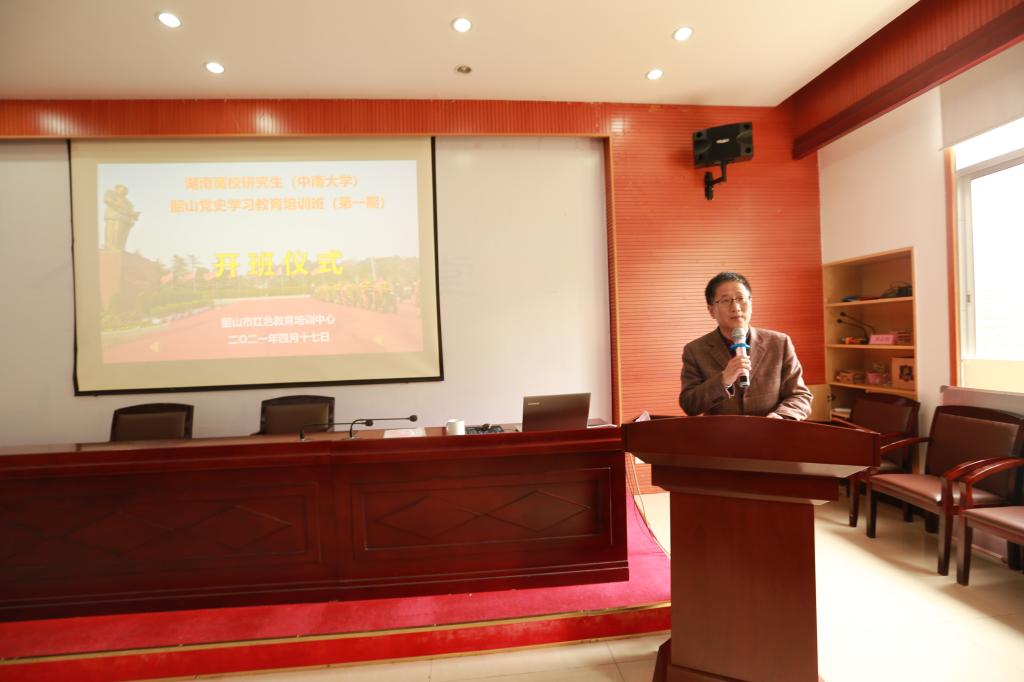 上午9点,参与活动的42名师生学员参加了本次活动的开班仪式,同时也标志着湖南省高校研究生走进韶山学党史活动全面启动。开班仪式上,韶山红色教育培训中心执行经理毛敏向学员们表示欢迎,并详细的介绍了韶山在党史学习教育中的重要地位,张金学副书记向在场学员介绍了开展党史学习教育的重要性及开展此次培训班的目的,同时提出统一思想认识、聚焦目标任务和强化学习落实的具体要求,鼓励学员们准确把握党史学习要求,深刻领会韶山党史精神内涵,努力践行初心使命和责任担当。随后,湖南省人民政府参事、中共湖南省委宣传部原副部长、湖南省党史办原主任张志初为学员们主讲题为《领航青春正百年》的专题党课,他从百年之前、百年之路和百年之悟三个方面深刻阐释了中国共产党百年发展历程,用通俗易懂的语言对党史进行深入浅出的讲解,引经据典,以小见大,收获在场学员的阵阵掌声。