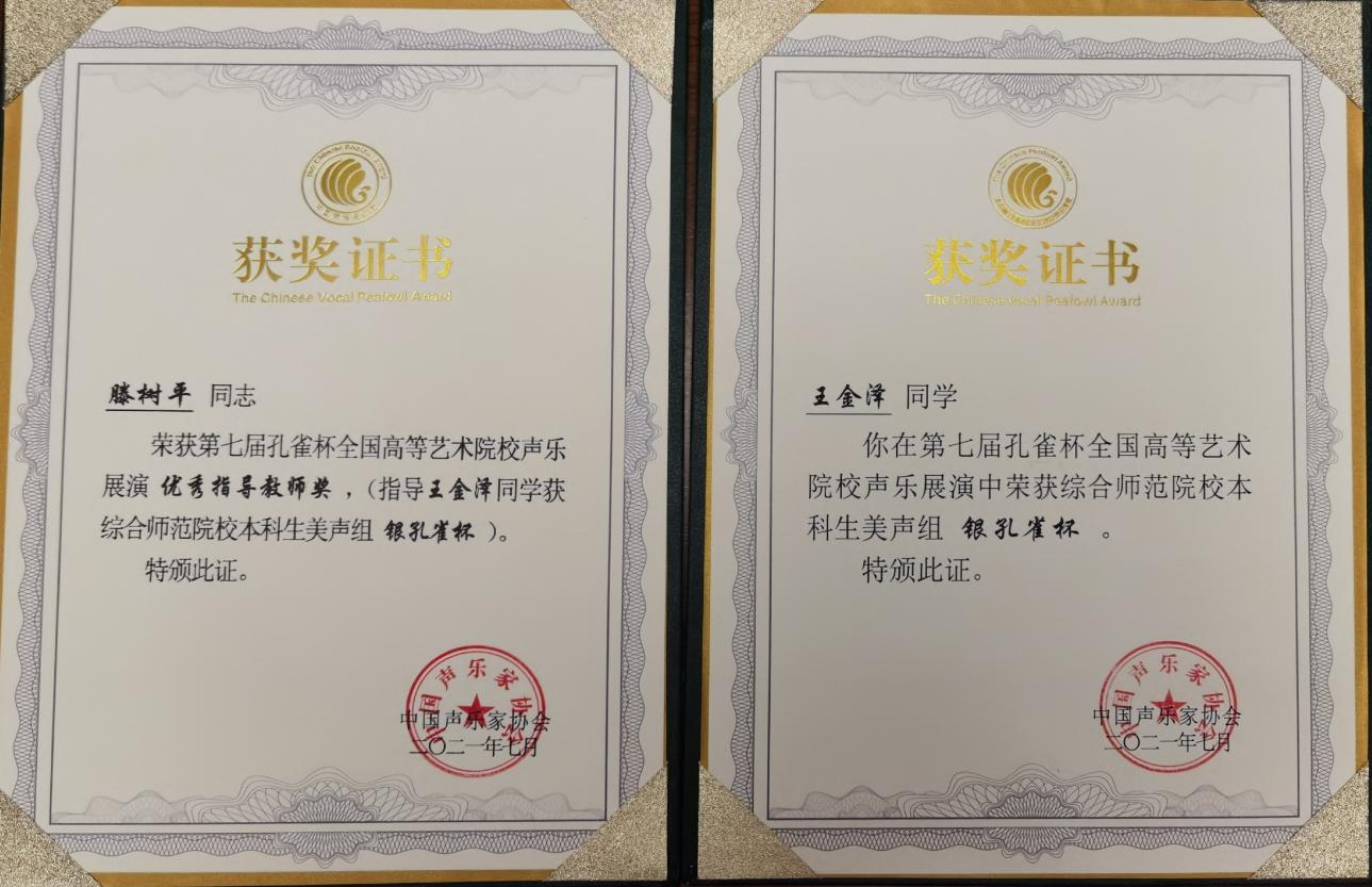 2021年7月22日至28日,“第七届孔雀奖全国高等艺术院校声乐大赛”在四川成都举行。本次大赛共有来自全国209所院校2171名选手参加,经过激烈角逐,我院音乐舞蹈系大三员工王金泽荣获综合师范院校(本科生)美声组“银孔雀”奖,专业导师滕树平副教授荣获“优秀指导教师奖”,球王会体育官网荣获“优秀组织奖”。