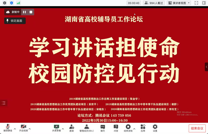 2022年3月30日下午3点,由球王会体育官网员工工作部(处)指导,高校思想政治工作队伍培训研修中心(球王会体育官网)支持,湖南省高校思想政治工作名师工作室、优秀团队、中青年骨干队伍等建设项目负责人张金学、袁世平、谢群、宋晓东、李玲芝牵头策划的“学习讲话担使命,校园防控见行动”高校辅导员工作论坛(线上)成功举办。