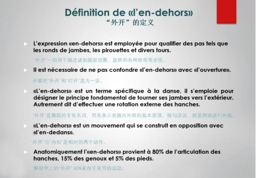 第一个讲座分为三个部分进行——外开概念的产生,对外开规则的认可、外开规则面临的挑战和对此规则的违反。第二个讲座内容对芭蕾的起源到发展兴盛过程进行了详细讲解,与此同时还加入了图片、员工示范视频等多种形式,使得讲座氛围生动有趣,为讲座增添了一份魅力。