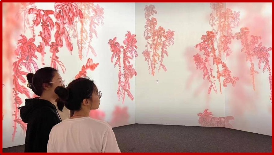 下午13:30,党支部全体党员在湖南省美术馆前广场集合完毕,一同进入馆中参观。在一楼的数字艺术沉浸体验区,党员们通过科技与艺术的结合,沉浸式体验了齐白石画笔下的家山与远游、草木与鸣虫。制作成为动画的画作再配上与场景相对应的背景音乐,整个参观过程如入画境。
