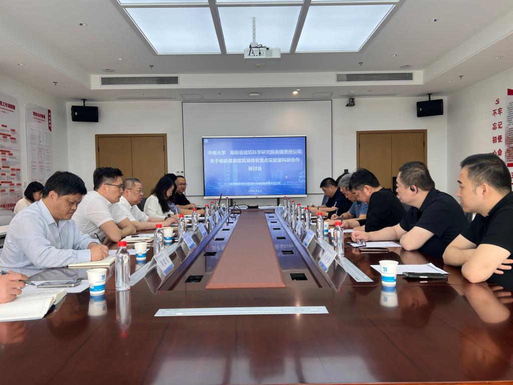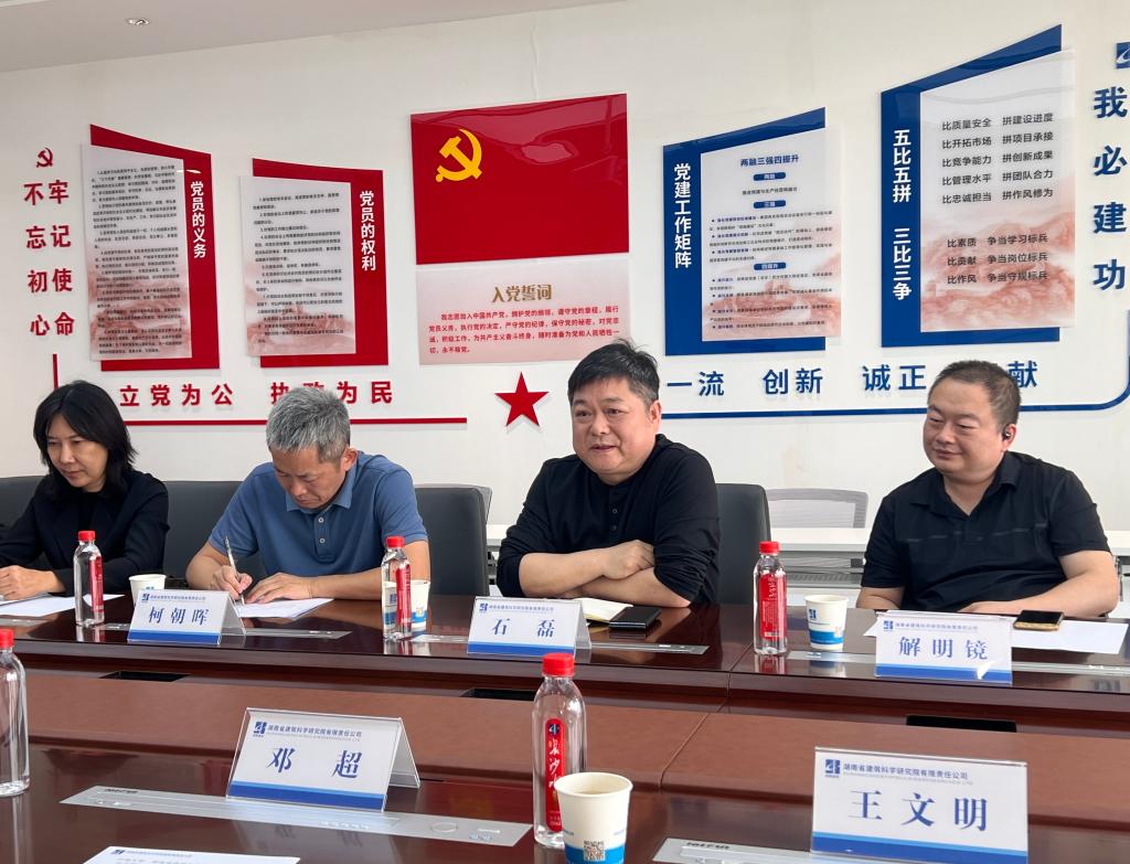 6月6日,公司党委书记柯朝晖、经理石磊带队赴湖南省建筑科学研究院走访调研,副经理刘雪梅、解明镜,低碳健康建筑湖南省重点实验室副主任柳思勉、刘少博,学工办巫建辉共同参加。省建科公司党委书记、董事长戴勇军,党委副书记、副董事长、总经理彭琳娜,党委委员、副总经理兼总工程师邓超,副总经理、总建筑师周湘华等相关人员陪同调研。